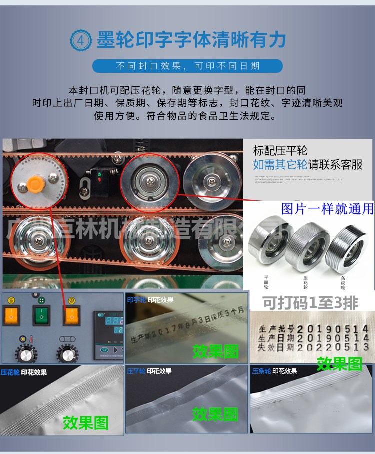 該機具有連續(xù)輸送、封口、油墨印制標簽(出廠日期、生產(chǎn)批號等)一次完成之功效,可封合印制任何一種可熱性的薄膜。
